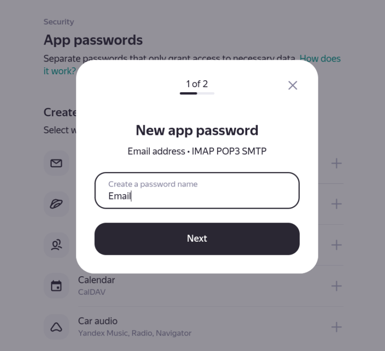 Use this as your password in the email settings on your phone app, tablet app or on a computer in Outlook, Thunderbird, etc. If you lose this password in future, you can come back and create a new one.