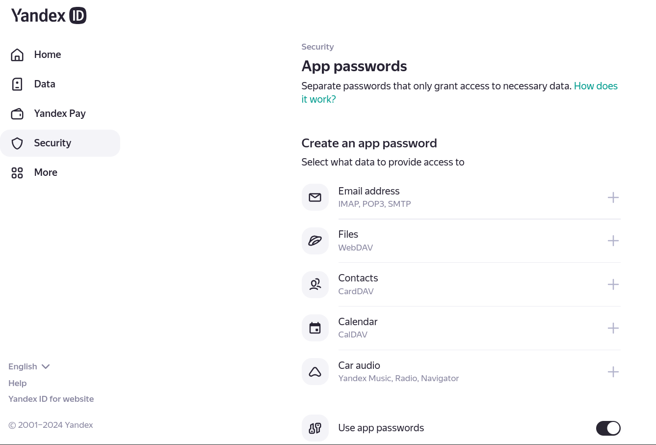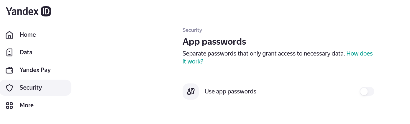 Scroll to the bottom of the Security page that opens and go to “App passwords”. Click on “Use app passwords”.